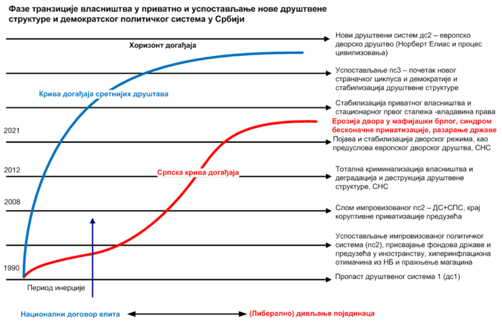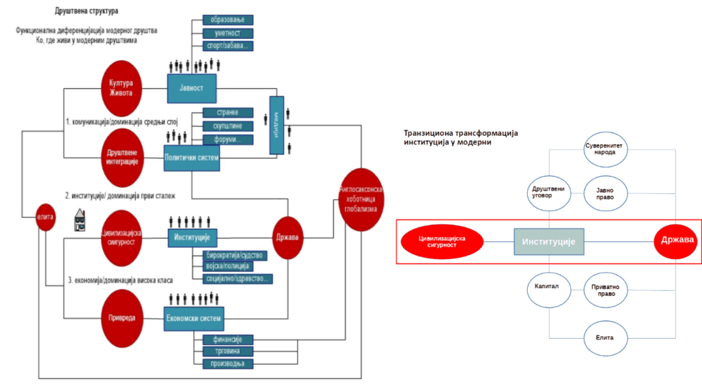 Прво и основно, не треба мешати сигурност само са безбедношћу. Сигурност је много шири и значајнији појам и он је конститутиван како за цивилизацију (то је идеја која је конституише, наспрам дивљаштва, али и природног окружења – „света живота“ као таквог од кога нас чува), тако и за сваку државу. Без сигурности нема уређености државе. Наше понашање и очекивања као одавно цивилизованих људи везани су за њу, како за окружење (природу), тако за наше односе, те за стварање институција, норми цивилизованог живота и сарадње у таквој средини која је сама испарцелисана (функционално структуисана) са сигурносним правилима понашања (њеним нормативним инсталацијама, како друштвеним, тако и техничким, шта би ми данашњи без електричне енергије, уосталом то смо видели 1999. кад је НАТО разбојнички бомбардовао само како би нас малтретирао), онда и очекивањима према којима се сви ми орјентишемо. А кад сигурност изостане као за Србе на КиМ, или, у Новом Саду само због брлога умишљених власника наших живота, онда народ свакако има право на побуну, јер ми више немамо пуне услове елементарне цивилизацијске сигурности у нашем националном друштву. Тако да ми немамо наивно посла са аутократијом, него са нечим много озбиљнијим кад је наша сигурност у овом степену доведена у питање да губимо смртоносно елементарну цивилизацијску сигурност, док нас на све стране преплављује дивљаштво (укључујући и дивље насеље испред Скупштине Србије и арлаукајућа музикантска дрека која од ових долази, а неки су и доказани насилници). Самим тим трпи и наша егзистенција и култура живота (трпи и привреда у опште произвољности корупције). Свакако све ово се може приписати пошасти које нам је донео СНС, али како су ови настали и постало је могуће да у овој мери приграбе власт више од деценије. Више пута сам сам понављао причу генезе политичких прилика (2008. слома политичког система и насталог вакума) и самог СНС (вођство СРС + западни странци + ДС – што сви знамо), што су Западни странци тад искористили да себи доведу у Србији на власт себи послушније (који од тад испуњавају све што им ови траже, а овде дивљачки раде шта хоће претварајући нас коначно у своје власништво), али и неколико пута сам причао да поред историјске и транзиционе кризе битну улогу, ако не и пресудну игра дуго неуспели процес стварања пост-транзиционог друштва. Ту се у пуном смислу подбацило, јер није ваљано озакоњена улога капитала, према праву, али и, према обавезама, а посебно у погледу на недељиви суверенитет народа, који је кључан за систем модерне, и то таквог кординантног система народа у модерни: 1) да нико не може (ни једна клика) да делује против интереса народа у националној држави и 2) натегтнутије за сваку демократију, да народ треба да је у модерни у легибус-солутус-позицији, како то изричито наводи И. Маус. Цртао сам и одговарајућу шему, како то треба да изгледа и са јасно унесеном „дводеобом“ права, али и са осталим елементима што се тиче институционализације државе (премда сам лично мишљења да је потребно данас ојачати у овом степену технолошки развијеног света, што ће бити све више, поред јавног и приватног права, издвојити засебно и непосредно право сигурности, припадајуће и свима јасне одговорности, па да се говори о „тродеобном“ праву, а таква је и моја шема да би се постигла гаранција цивилизацијске 